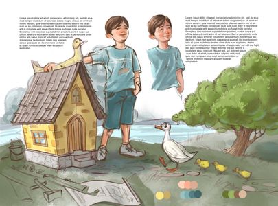 My first step is to learn about the story the client wants to create and whether I am a fitting illustrator for the project. Prior to signing the contract, the client will need to provide the layout of the book, the page size, the publisher template, and the desired style of the illustrations. When everything is clear, the contract is set and the client pays 35% of the commission up front.